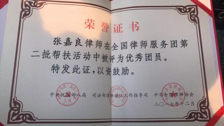 2017年12月14日,在全国第二批律师服务团工作总结会议上,张嘉良主任因工作成绩突出获得“全国律师服务团第二批帮扶活动优秀团员”荣誉称号。