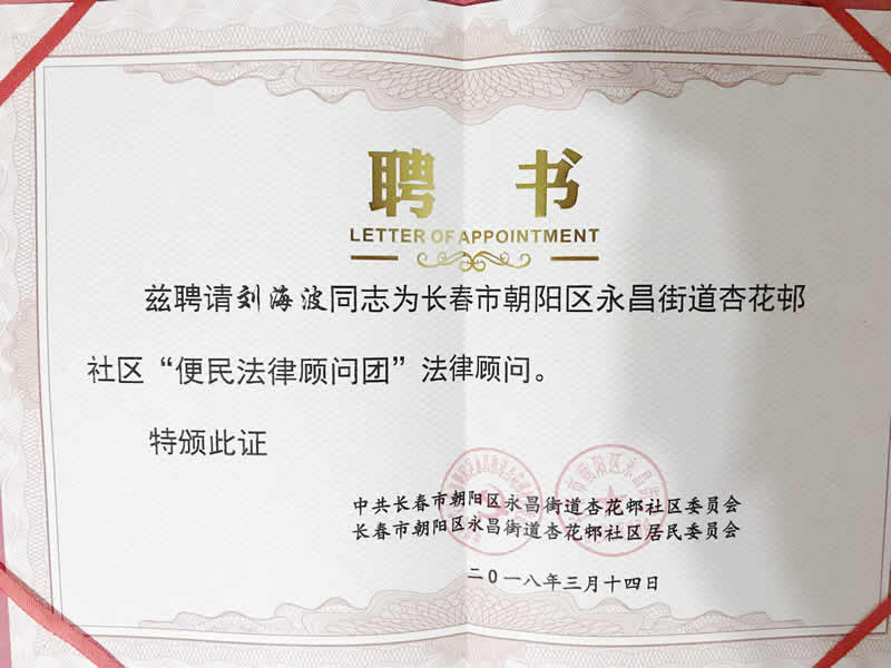 签约仪式上,刘海波主任被聘为长春市朝阳区永昌街道杏花邨社区“便民法律顾问团”法律顾问,刘亚东律师代表吉林吉翔律师所参加签约,并对长春电视台记者提出的关于百姓购买无产权证二手房在交易中的一些疑虑做出详细讲解。